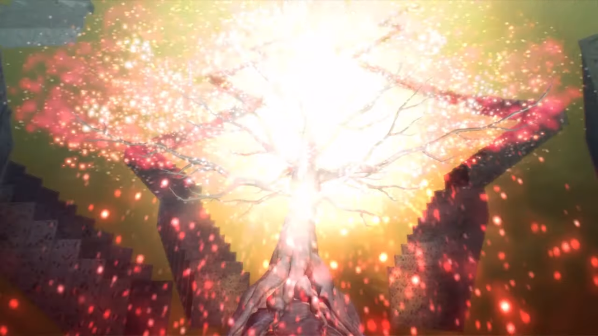 Curioso come, in modi e magari anche significati diversi, diversi JRPG ci fanno riferimento: Dragon Quest XI, Pokémon XY (mitologia a cui sono ispirati i tre leggendari della regione) ed Elden Ring, con una rappresentazione parecchio simile a quella presentata in Shin Megami Tensei V. L’albero appare nella dimensione del Da’at e, soprattutto, nella schermata di game over del gioco. In questa scena si vede il Nahobino finire KO sopra il luminoso albero, l’arbusto però assume un colore scuro mantenendo la luce solo nei livelli più alti quando il Nahobino si scompone nei due elementi che lo compongono. Essi si dissolvono e si intravedono diverse rampe di scale; a mio parere possono rappresentare le possibili strade che il Nahobino può percorrere grazie alle scelte prese durante la sua avventura. Quindi, un luogo legato ad una fase avanzatissima, per non dire finale, della nostra partita.